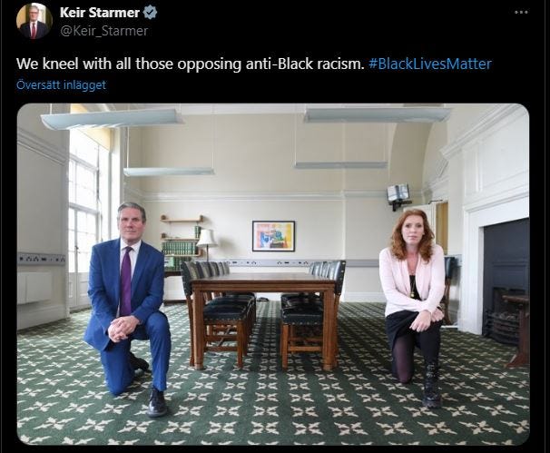 Det är juni 2020. Samtidigt som en stor del av världen håller sig inomhus med hot om kraftiga coronasanktioner tillåts en grupp ägna sig åt omfattande demonstrationer och kravaller världen runt. Black Lives Matter. För att hedra denna grupp publicerar Keir Starmer en bild på Xitter där han går ner på knä för att visa sitt stöd. Då är han oppositionsledare för Labour UK, idag är han premiärminister.