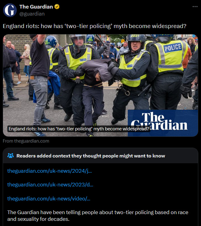 Bland vänstern i England, ex tidskriften The Guardian, har man tidigare använt begreppet “two-tier policing” för att beskriva hur kvinnor och minoriteter behandlas negativt. Men när begreppet används för att beskriva hur vita män kan råkat ut för samma sak så går tidskriften ut och menar att begreppet är “en myt".
