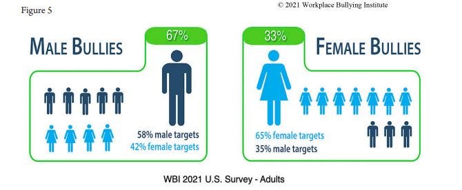 Män och kvinnors mobbing ser olika ut. Män är mer av equal opportunity offenders, de ger sig på alla. Jämställd mobbing skulle man kunna säga. Kvinnor ger sig i mycket högre utsträckning på andra kvinnor. Återkommande undersökningar av Workplace Bullying Institute bekräftar detta.